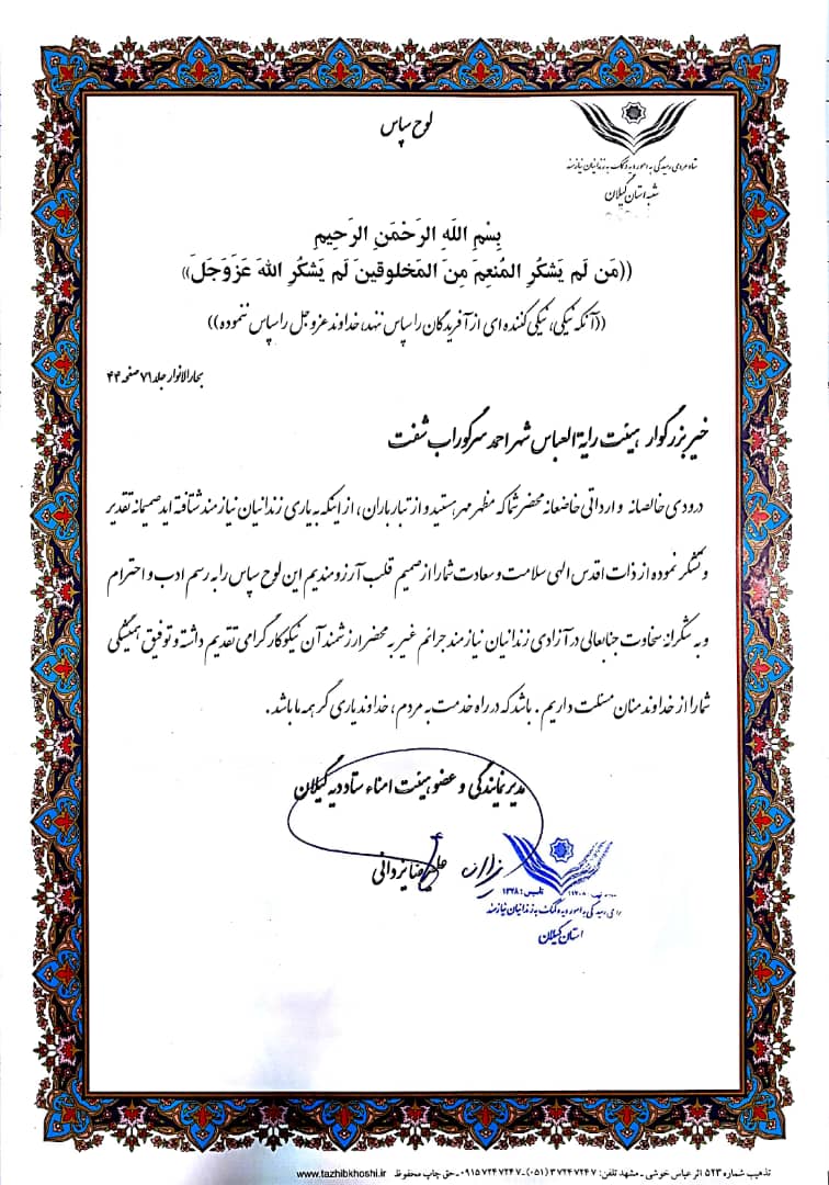 علیرضا یزدانی، مدیر نمایندگی و عضو ستاد دیه استان گیلان نیز با تقدیر از رفتار سخاوتمندانه مردم بهویژه اعضای هیئت رایه العباس شهر احمدسرگوراب می گوید یکی از امتیازات محبوب شدن نزد امام زمان، عمل صالح است و آزادی زندانیان با جرائم غیر عمد یکی از اعمال صالح است.