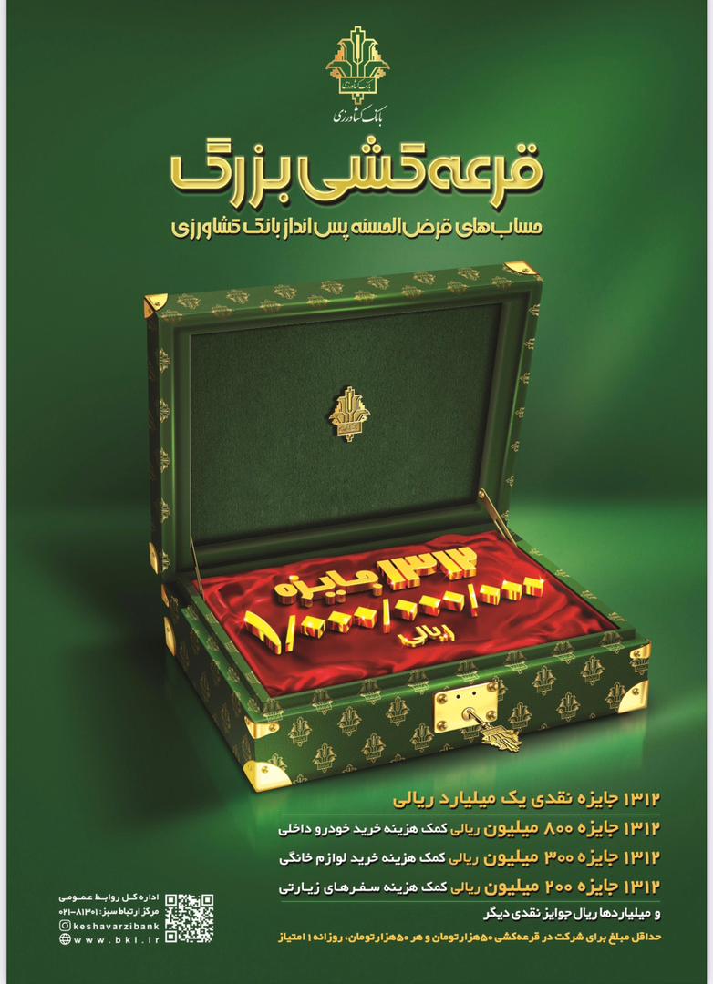 🔺۱۳۱۲جایزه نقدی یکمیلیارد ریالی 🔺۱۳۱۲ جایزه ۸۰۰ میلیون ریالی کمکهزینه خرید خودرو داخلی 🔺۱۳۱۲ جایزه ۳۰۰ میلیون ریالی کمکهزینه خرید لوازم خانگی 🔺۱۳۱۲ جایزه ۲۰۰ میلیون ریالی کمکهزینه سفرهای زیارتی 🔺و میلیاردها ریال جوایز نقدی دیگر… 🔹حداقل مبلغ برای شرکت در قرعهکشی ۵۰هزارتومان و هر ۵۰هزارتومان، روزانه ۱ امتیاز